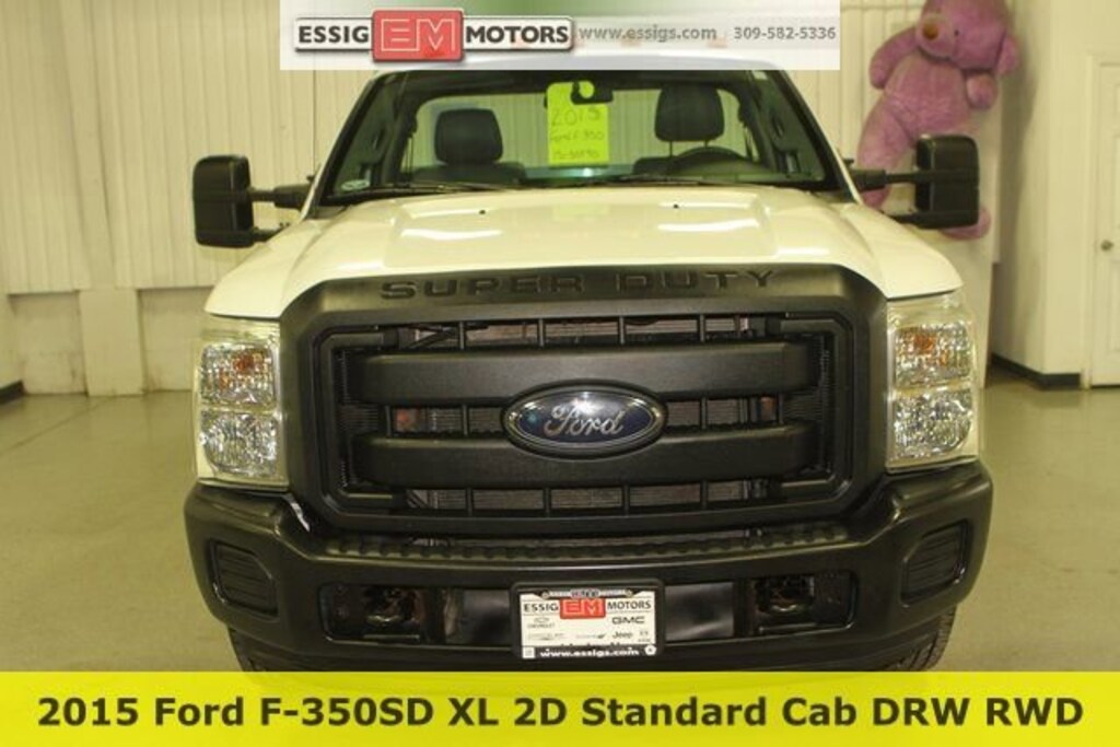 2015 Ford F-350SD XL 2D Standard Cab DRW RWD Oxford White **ONE OWNER, **LOW LOW MILES, **UTILITY BODY READY WORK TRUCK**, **ACCIDENT FREE VEHICLE TITLE, 6.2L V8 EFI SOHC 16V Flex Fuel, Dual rear wheels, Order Code 640A. Odometer is 3700 miles below market average! Located in Aledo Illinois, Essig Motors has been family owned and operated since 1989. Owner Jim Essig's experience in the auto industry began in 1975 working for his father's dealership in Washington, Illinois. We are honored to serve Mercer county, surrounding areas, and our growing online community with new, certified pre-owned, pre-owned, and also new and pre-owned commercial vehicles. Essig Motors offers an exceptional selection of new cars, trucks and SUVs including Chevrolet, GMC, Chrysler, Jeep, Dodge and Ram. Our knowledgeable, friendly sales staff is here to answer your questions and help you find the vehicle that meets your needs today!