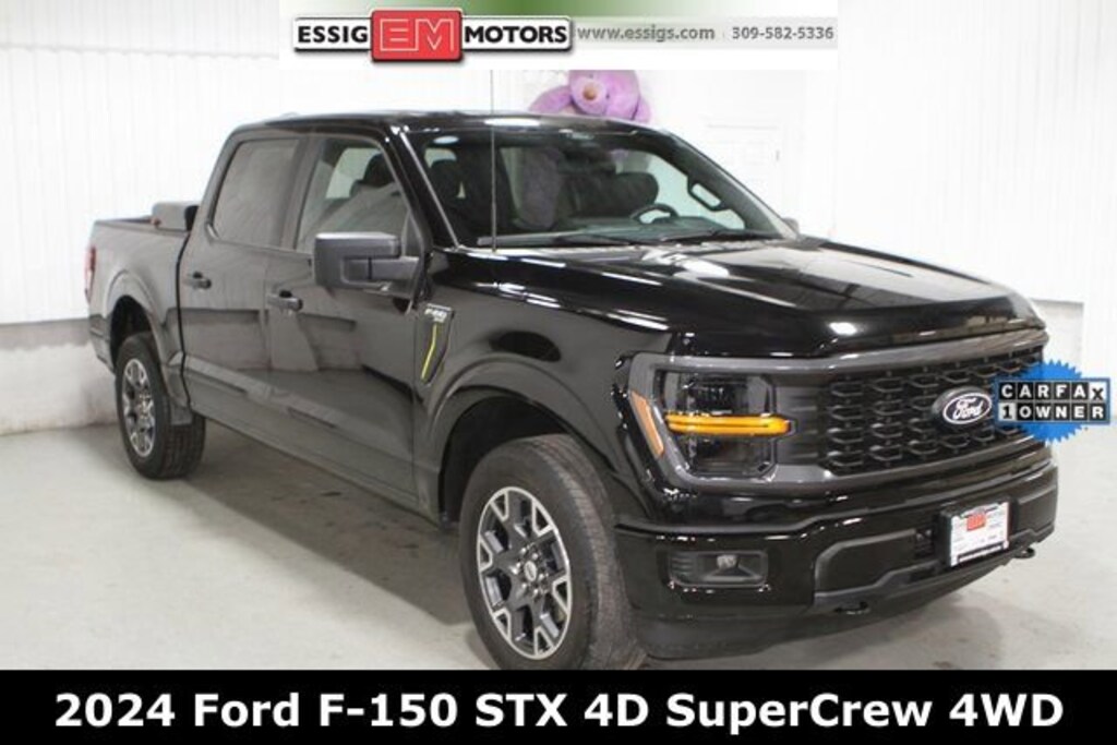 2024 Ford F-150 STX 4D SuperCrew 4WD Black Metallic **LOCAL TRADE, **ONE OWNER, **BACK-UP CAMERA**, **NAVIGATION, 2.7L V6 EcoBoost, Front Bucket Seats, Wheels: 20 Dark Gray w/Machined Aluminum. 18/23 City/Highway MPG Located in Aledo Illinois, Essig Motors has been family owned and operated since 1989. Owner Jim Essig's experience in the auto industry began in 1975 working for his father's dealership in Washington, Illinois. We are honored to serve Mercer county, surrounding areas, and our growing online community with new, certified pre-owned, pre-owned, and also new and pre-owned commercial vehicles. Essig Motors offers an exceptional selection of new cars, trucks and SUVs including Chevrolet, GMC, Chrysler, Jeep, Dodge and Ram. Our knowledgeable, friendly sales staff is here to answer your questions and help you find the vehicle that meets your needs today!